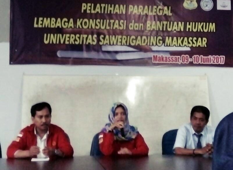 MAKASSAR.- Lembaga Konsultasi dan Bantuan Hukum (LKBH) Universitas Sawerigading (Unsa) Makassar bekerja sama BEM Fakultas Hukum Unsa menggelar kegiatan pelatihan paralegal dilaksanakan di kantor Camat Bontoala Makassar, (9-10/6/2017).